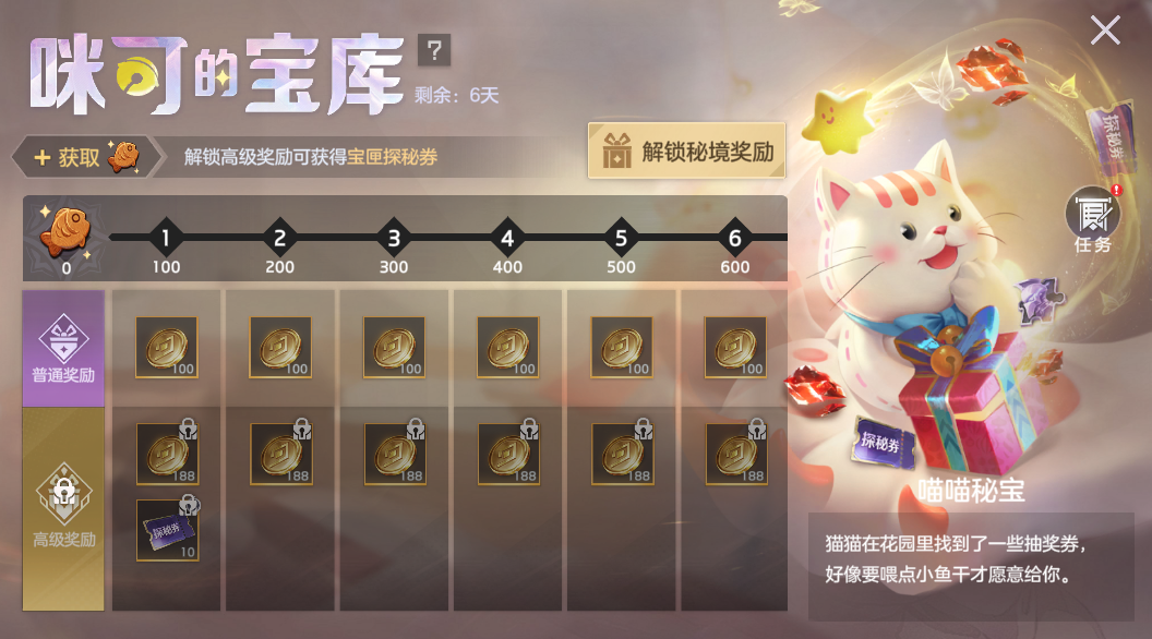 完成任务提升等级免费获取宝匣探秘券*10、金币,宝匣探秘券可用于神秘宝匣抽奖。付费30元可获得宝匣探秘券*30、赤焰灵玉*15、皮肤碎片*10;付费98元可以额外获得宝匣探秘券*40、赤焰灵玉*60等奖励。