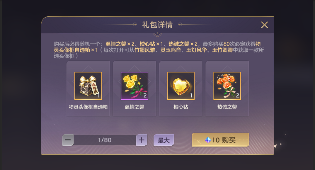 物灵秘宝限时售卖,每抽随机获得温情之馨*2、橙心钻*1、热诚之馨*2中任一奖励,最多购买80次必定获得物灵头像框自选箱(包含竹墨风雅、灵玉鸣音、玉灯风华、玉竹卿卿)