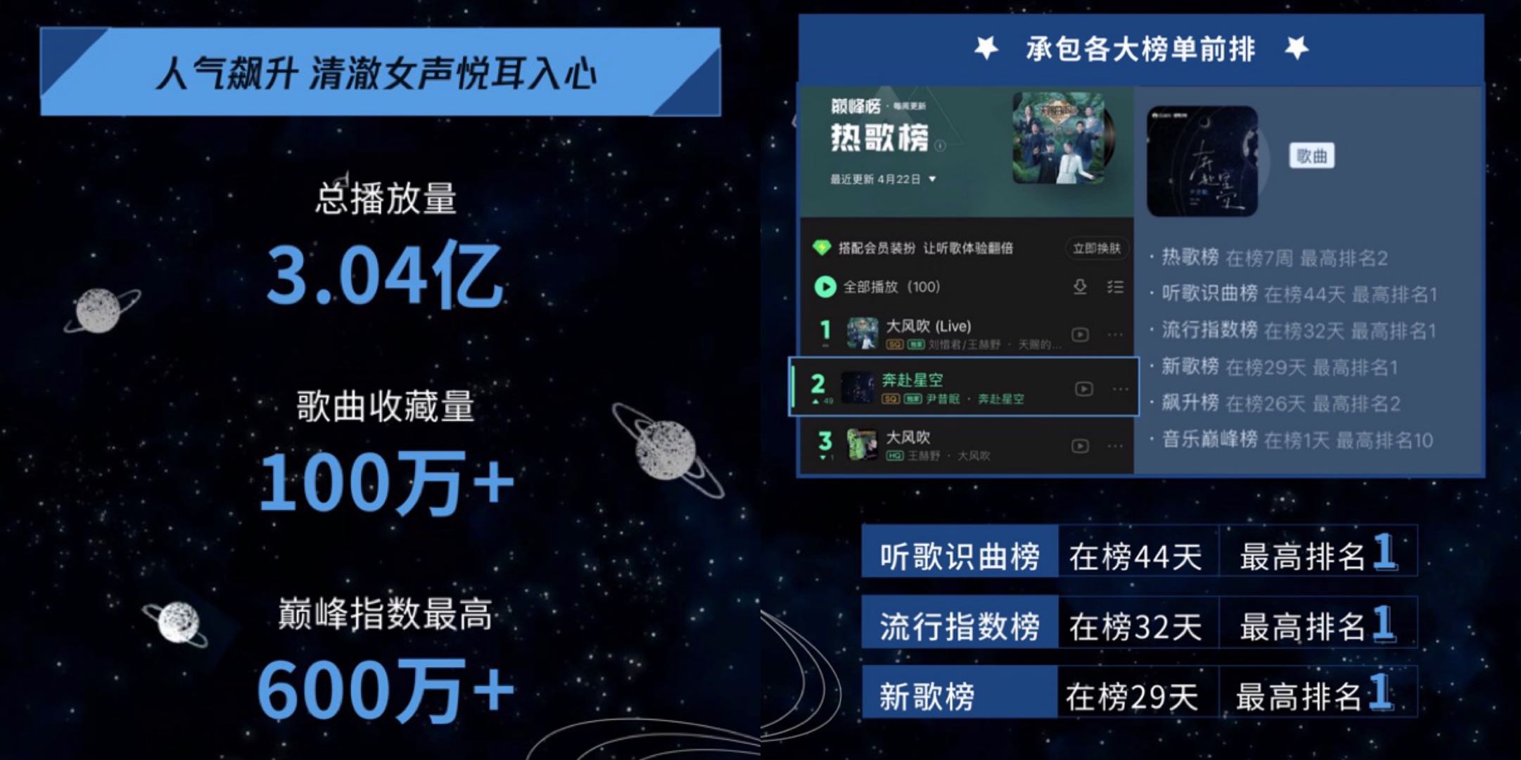 截至发稿时,《奔赴星空》在的播放量已经突破了3亿,收藏数也高达100万+,目前这一数据仍在持续攀升。同时该歌曲“破圈”火遍各大短视频平台,引起全网翻唱热潮。
