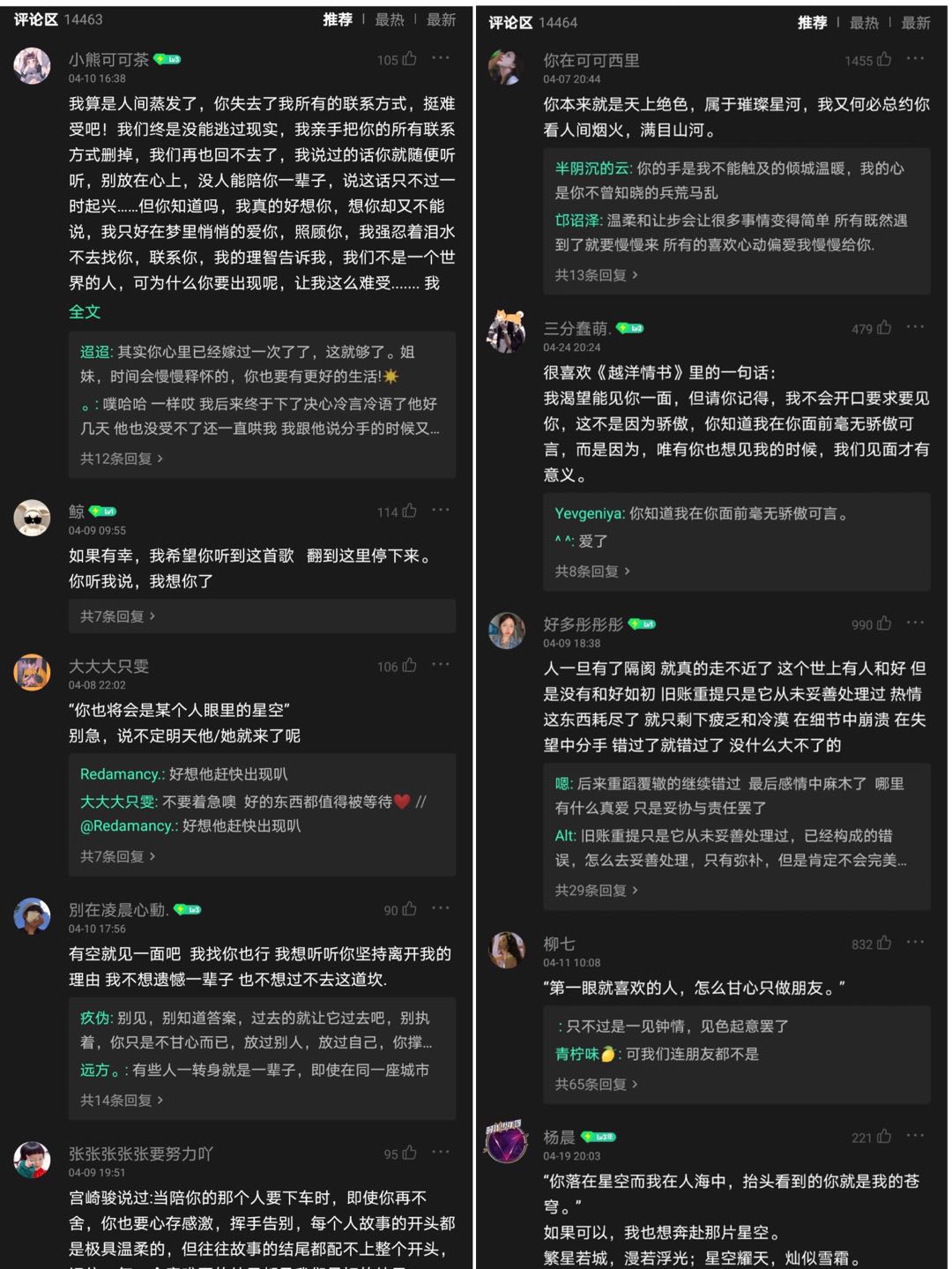 “你落在星空而我在人海中,抬头看到的你就是我的苍穹”,音乐人甜美的嗓音中包裹着伤感的底色,水流声交织钢琴曲的背景音平添了几分夏日浪漫的氛围感,而歌词则以女生的第一视角轻诉对于“双向奔赴爱情”的希冀,引发了不少网友的共鸣。万千乐迷涌入《奔赴星空》歌曲评论区,集体感怀心事,互相诉说对于感情的遗憾与憧憬。