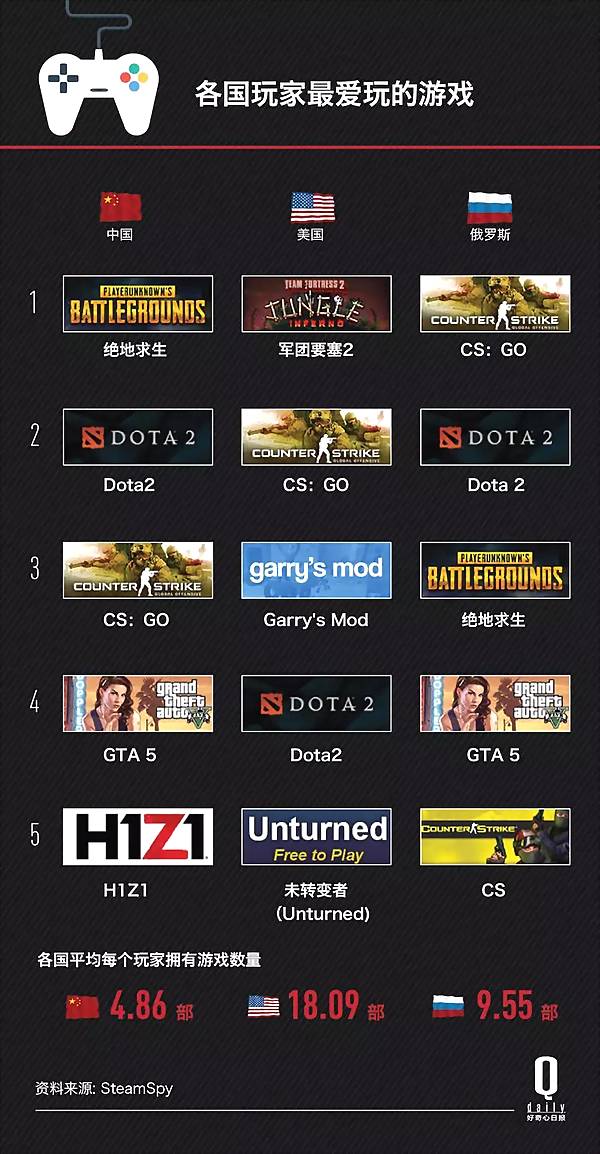 根据Steamspy的统计,中国游戏玩家平均每人拥有的游戏数量仅为4.86个,美国则为18.09个。最高的是英国,平均每人拥有21.62个。
