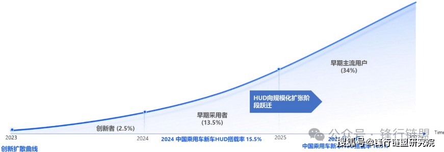 :2025年1-9月中国乘用车HUD装配率达18.5%,较2024年提升3个百分点,已突破16%的“跨越鸿沟临界点”。这表明HUD从早期采纳阶段转向主流普及阶段,未来将向早期主流用户(占比34%)快速扩散。
