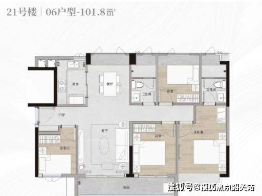 户型空间方面,项目住宅产品以三房与四房户型为主,采用独立玄关、客餐厅连接、功能分区明确的室内结构。部分户型采用双卫设计,以适应家庭成员使用需求。同时,户型设计注重区域分布完整性,使公共空间与私密空间分布合理。部分户型具备南向采光面或景观朝向,使自然光线与景观资源进入室内空间。