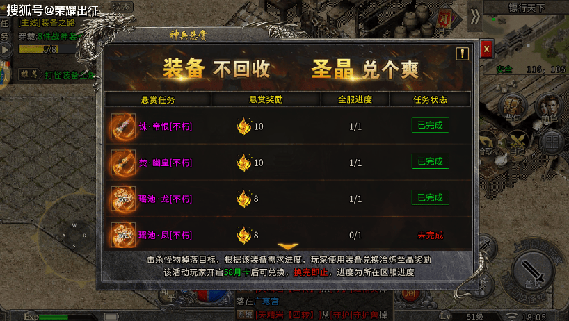 2. 装备回收(稳定渠道):所有非绑定装备均可回收为元宝,回收价格按装备等级、品质划分,具体参考:1-2转装备(10-50元宝/件)、3-4转装备(50-200元宝/件)、5-6转装备(200-1000元宝/件)、极品装备(1000-5000元宝/件)。新手期可回收低阶装备,中期重点回收多余的3-4转装备,后期可将非极品的高阶装备回收,既节省背包空间,又能稳定获取元宝,避免资源浪费。