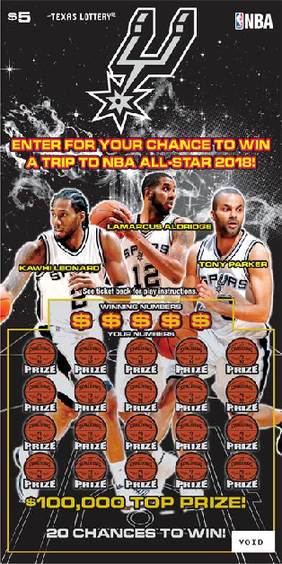 据了解,德克萨斯州彩票公司和马刺球队合作推出新款即开票,票面设计以篮球为主题,印有马刺队员;票面金额为5美元,最高可获得10万美元大奖,所有票面奖金总额高达1020万美元。除此之外,玩家还有机会获得2018年NBA全明星赛双人游。